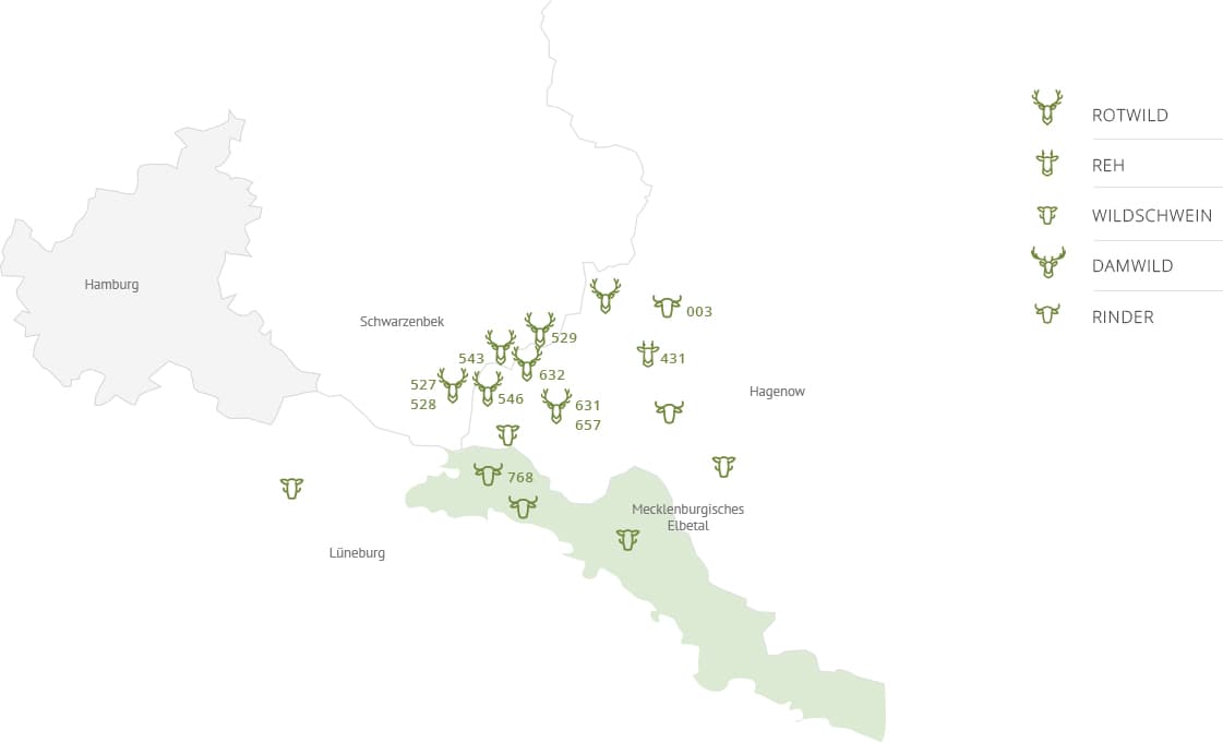 sowie das von artgerecht gehaltenen Rindern und Schafen, aus den Beständen lokaler Bio-Bauern aus dem UNESCO Biosphärenreservat “Naturlandschaft Elbe”.